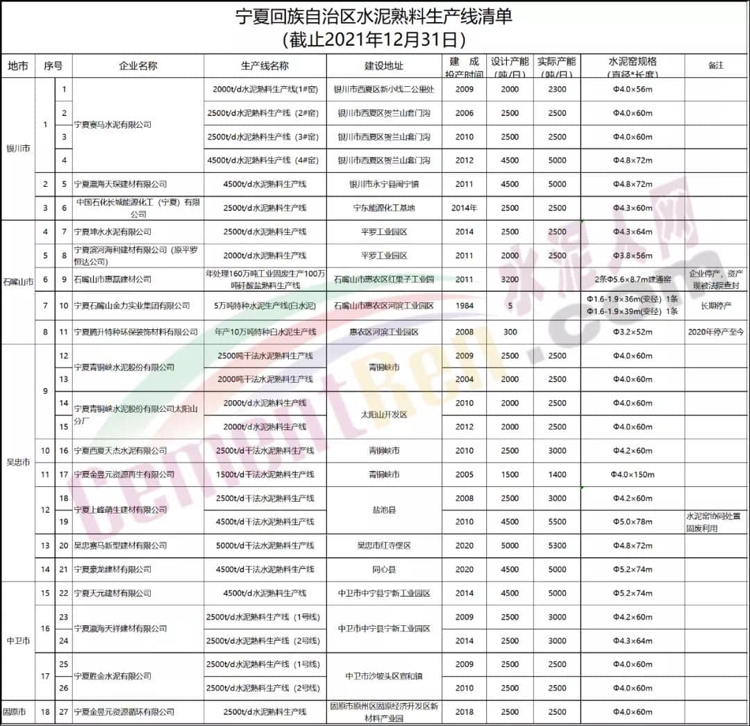 2月18日,寧夏回族自治區工信廳發布《2021年度水泥熟料平板玻璃生產線更新公示》,公示顯示,寧夏回族自治區有27條水泥熟料生產線,合計產能2295萬噸,其中有5條已停產。