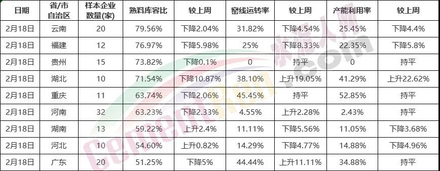 據水泥人網信息中心數據,絕大多數區域樣本企業庫容比均有下降,產能利用率小幅回升。截止2月18日,水泥人網重點監控的近三百家水泥企業,熟料庫容比64.17%,較上周小幅下降。窯線運轉率33.33%,產能利用率35.91%,較上周均有上升。