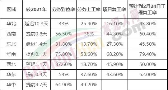 分區域來看,華中地區較2021年提前了4.7天,勞務到位率及上工率達到64.9%、49.2%;華南地區勞務到工率達到75.8%,上工率達到58.6%。