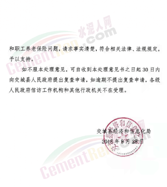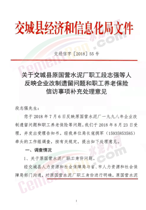 網友提供的文件顯示,2018年9月28日,交城縣經信局《關于交城縣原國營水泥廠職工段志強等人反映企業改制遺留問題和職工養老保險信訪事項補充處理意見》的文件提到,段志強于2018年7月6日反映原國營水泥廠一九九八年企業改制遺留問題和職工養老保險等問題。已于當年8月23日受理,并發出受理告知書。工作組調查,按有關規定,提出如下處理意見。