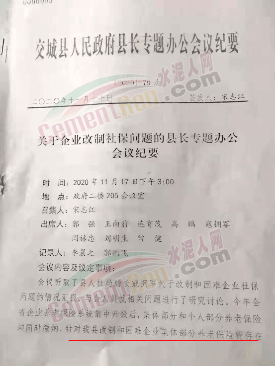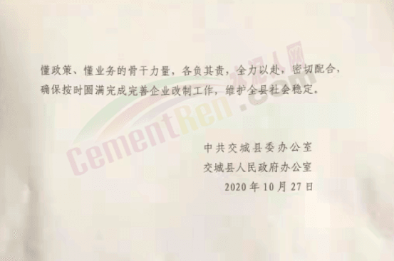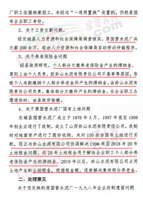 日前,有網友向水泥人網反映,交城縣原國營水泥廠企業改制遺留問題和職工養老保險問題至今未得到解決幾點問題。