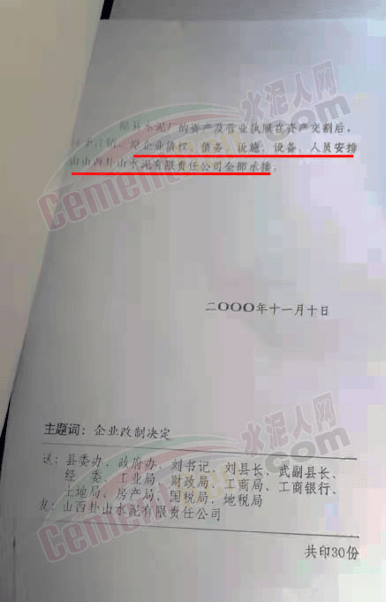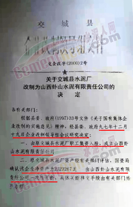 2000年交城縣《關于交城縣水泥廠改制為山西卦山水泥有限責任公司的決定》文件中提到,經縣委、政府1997年12月19日企業改制領導組會議研究決定,由原交城縣水泥廠職工集資入股,成立山西卦山水泥有限公司。