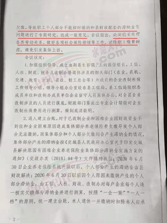 交城縣2020年11月17日《關于企業改制社保問題的縣長專題辦公會議紀要》中提到會議針對改制和困難企業集體部分養老保險費存在欠繳,導致職工個人部分不能按時繳納和縣財政配套的滯納金等問題進行了專題研究,且達成了一致意見。會議指出,必須穩妥處理各類勞動關系,做好各項社會保險接續等工作,消除職工繳費顧慮,避免引發集體上訪。