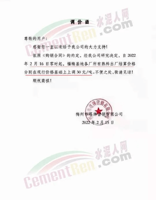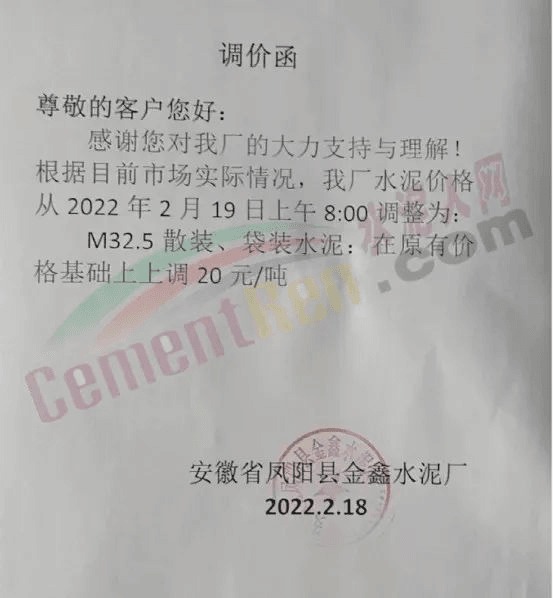2月22日,江蘇無錫金久水泥通知上調(diào)水泥價格30元/噸。