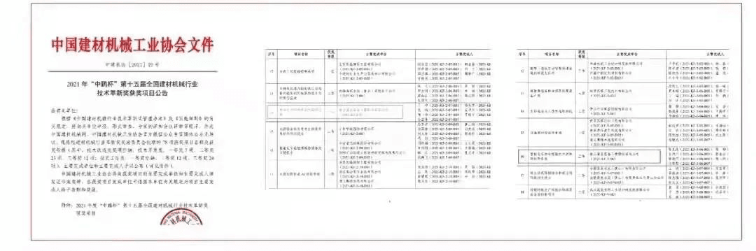 2021年,冀東裝備公司累計獲得各類科技獎項16項。其中“移動式封閉型反擊式破碎方箱”“智能化在線非接觸式水泥庫防粘附系統”分別榮獲第十五屆全國建材機械行業技術革新二等獎、三等獎,這也是冀東裝備公司連續四屆榮獲全國建材機械行業技術革新獎。2021年12月,全國建材裝備標準化技術委員會授予冀東裝備公司“‘十三五’建材機械標準化工作先進集體”榮譽稱號,冀東裝備公司參加編寫的GB/T 32994-2016《水泥工業用回轉窯》國家標準被評為“十三五”全國建材機械行業技術標準優秀獎。
