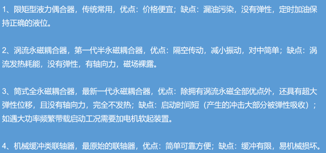 其中,耦合器作為水泥行業(yè)原料破碎、輸送、預(yù)熱、煅燒、熟料輸送、冷卻等生產(chǎn)進(jìn)程中的關(guān)鍵設(shè)備,其性能對(duì)于提高設(shè)備運(yùn)行的可靠性、減少維護(hù)費(fèi)用、節(jié)能降耗等具有重要的意義。目前市場(chǎng)中常見(jiàn)的緩沖類耦合器有限矩型液力耦合器、渦流永磁耦合器、筒式全永磁耦合器、機(jī)械緩沖類聯(lián)軸器等,各類耦合器的主要優(yōu)缺點(diǎn)如下: