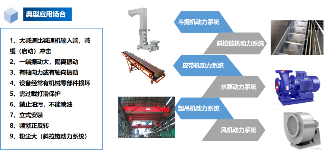 以江蘇磁谷科技股份有限公司(以下簡(jiǎn)稱“江蘇磁谷”)的筒式全永磁耦合器為例,目前其在海螺水泥、西南水泥、中材水泥、天山水泥、金隅冀東水泥、華新水泥、紅獅水泥等多家大型水泥企業(yè)的斜拉鏈機(jī)、提升機(jī)、皮帶機(jī)、輥壓機(jī)、刮板機(jī)、堆取料機(jī)、原料磨選粉機(jī)、蓖冷機(jī)、渣漿機(jī)、破碎機(jī)、風(fēng)機(jī)、水泵、混料機(jī)等多個(gè)水泥生產(chǎn)設(shè)備上都有應(yīng)用,典型應(yīng)用場(chǎng)合主要集中在以下幾個(gè)方面: