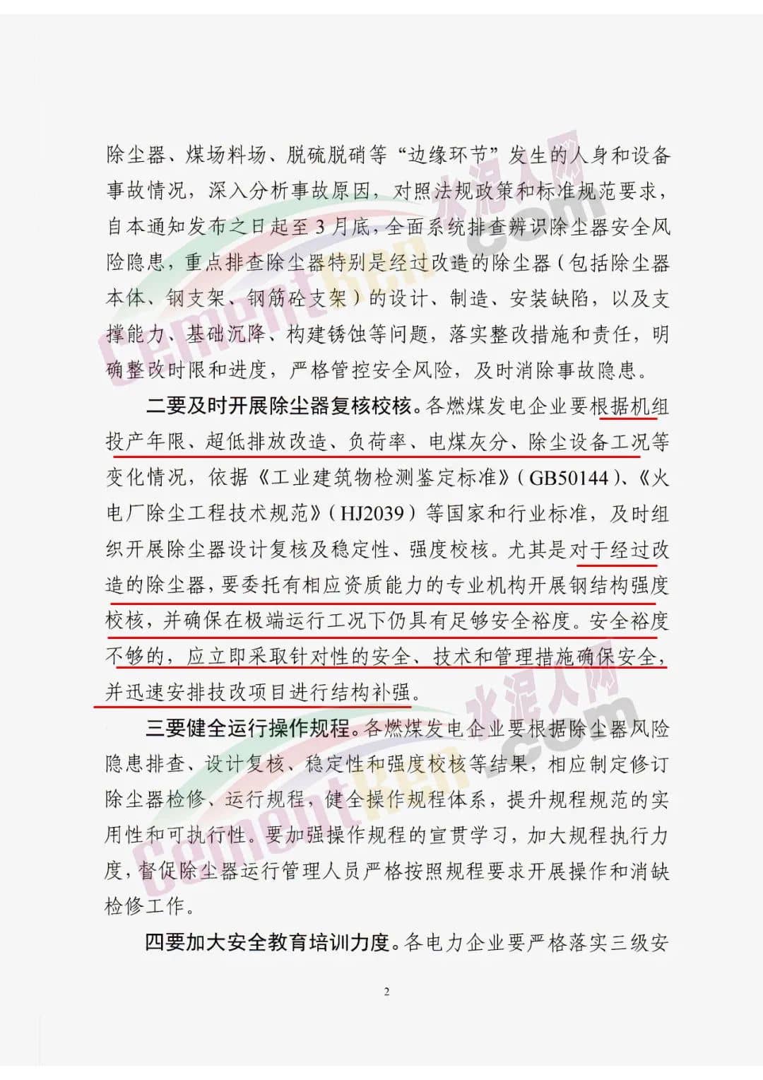 各燃煤發(fā)電企業(yè)要跟蹤了解近年來(lái)除塵器、煤場(chǎng)料場(chǎng)、脫硫脫硝等"邊緣環(huán)節(jié)"發(fā)生的人身和設(shè)備事故情況,深入分析事故原因,對(duì)照法規(guī)政策和標(biāo)準(zhǔn)規(guī)范要求,自本通知發(fā)布之日起至3月底,全面系統(tǒng)排查辨識(shí)除塵器安全風(fēng)險(xiǎn)隱患,重點(diǎn)排查除塵器特別是經(jīng)過(guò)改造的除塵器(包括除塵器本體、鋼支架、鋼筋砼支架)的設(shè)計(jì)、制造、安裝缺陷,以及支撐能力、基礎(chǔ)沉降、構(gòu)建銹蝕等問(wèn)題,落實(shí)整改措施和責(zé)任,明確整改時(shí)限和進(jìn)度,嚴(yán)格管控安全風(fēng)險(xiǎn),及時(shí)消除事故隱患。