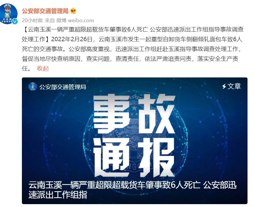 據公安部交通管理局微博消息,2022年2月26日,云南玉溪市發生一起重型自卸貨車側翻傾軋面包車致6人死亡的交通事故。公安部高度重視,迅速派出工作組趕赴玉溪指導事故調查處理工作,督促當地盡快查明原因,查實問題,查清責任,依法嚴肅追責問責,落實安全生產責任。