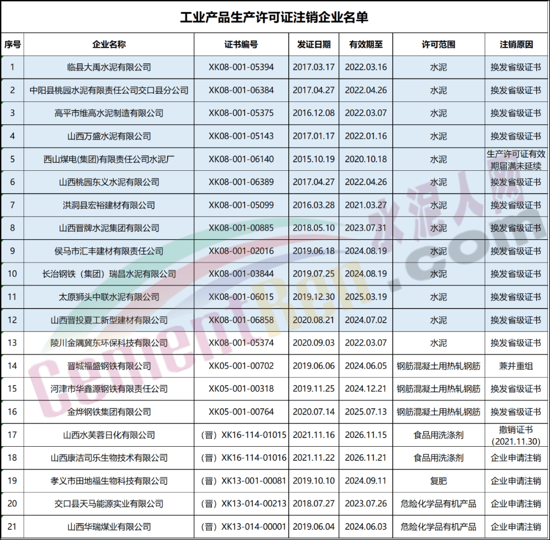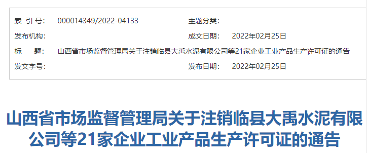 日前,山西省市場監(jiān)管局發(fā)布《關(guān)于注銷臨縣大禹水泥有限公司等21家企業(yè)工業(yè)產(chǎn)品生產(chǎn)許可證的通告》稱,按照相關(guān)規(guī)定,山西省市場監(jiān)督管理局決定對臨縣大禹水泥有限公司等21家企業(yè)工業(yè)產(chǎn)品生產(chǎn)許可證予以注銷(名單見附件)。
