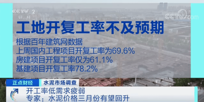 相關數據顯示,上周國內工程項目開復工率為69.6%,同比下降17.3%,其中,房建項目表現不佳,開復工率僅為61.1%;基建開復工率78.2%。總體來看,二月份工地開工不及預期,導致水泥需求冷淡,抑制了水泥價格。由于下游的勞務到位,包括上工情況,節奏還是有點慢。只是從水泥混凝土砂石這個板塊來看,目前這個銷量同比去年下降20%到50%。