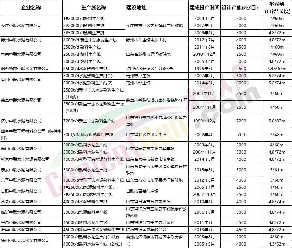 山東省境內(nèi)中聯(lián)水泥生產(chǎn)線清單