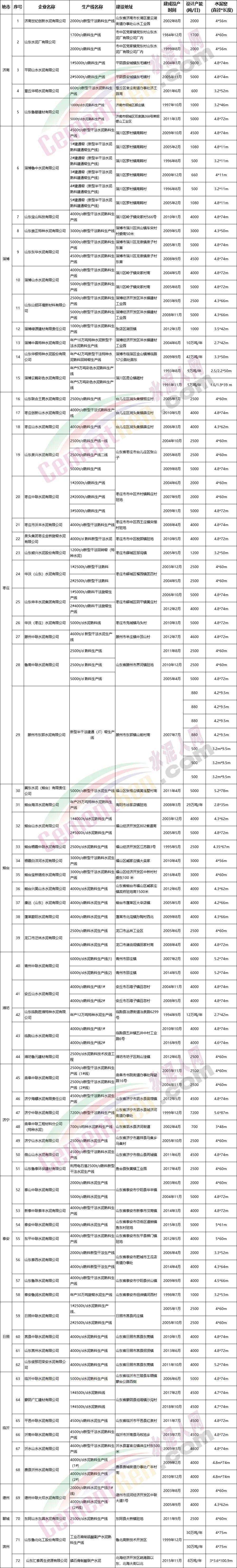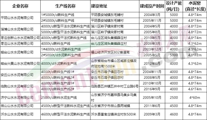 山東省境內(nèi)山水水泥有限公司熟料生產(chǎn)線清單