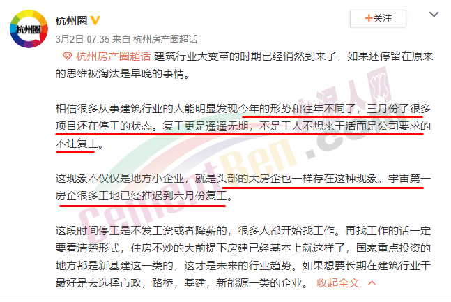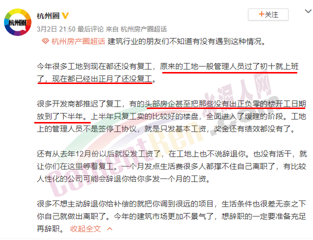 近期,有網友在社交媒體杭州房產圈超話欄目發起關于建筑行業的討論稱,很多工地到現在都還沒有復工,原來的工地一般管理人員過了初十就上班了,現在都已經出正月了還沒復工。