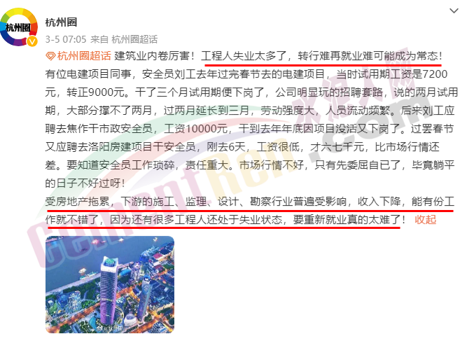 目前工程行業失業的人很多,轉行難再就業難可能成為常態。受房地產拖累,下游的施工、監理、設計、勘察行業普遍受影響,收入下降將成為常態。