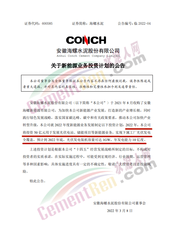 3月8日,安徽海螺水泥股份有限公司發(fā)布《關(guān)于新能源業(yè)務(wù)投資計劃的公告》稱,2022年,海螺水泥將投資50億元用于發(fā)展光伏電站、儲能項目等業(yè)務(wù),實現(xiàn)下屬工廠光伏發(fā)電全覆蓋;預(yù)計到2022年底,光伏發(fā)電裝機容量可達1GW,年發(fā)電能力10億度。