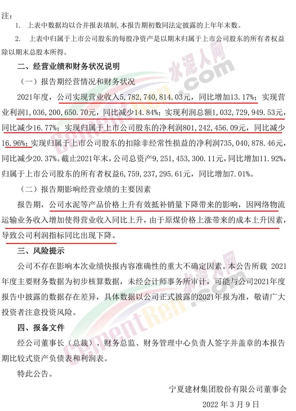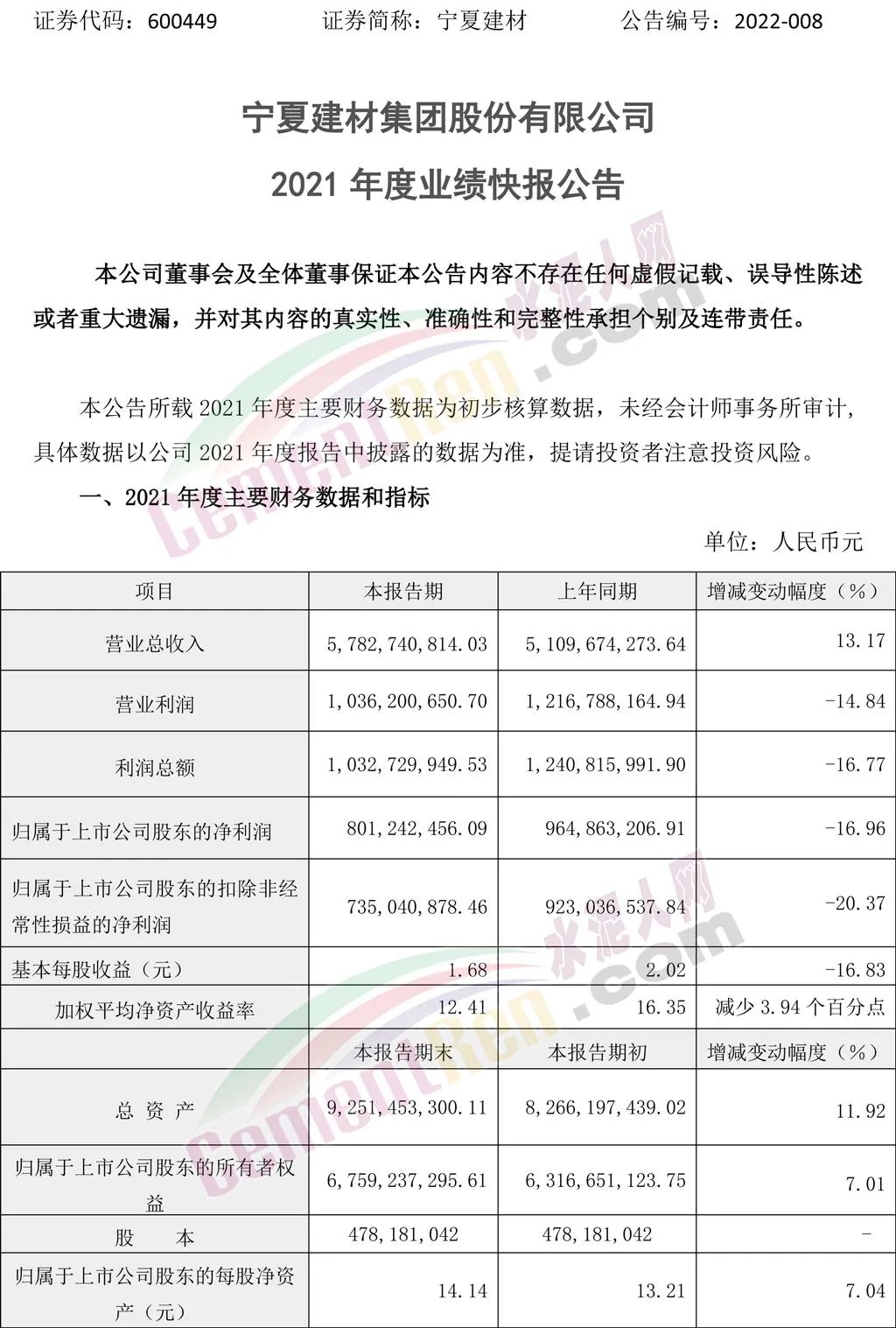 3月9日,寧夏建材(600449)發(fā)布2021年度業(yè)績快報公告,公告顯示,2021年1-12月營業(yè)總收入為5,782,740,814.03元,比上年同期增長13.17%;歸屬于上市公司股東的凈利潤為801,242,456.09元,比上年同期下滑16.96%。