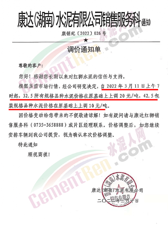 據水泥人網了解,春節后開工至今,湖南各區域水泥價格普遍呈上漲趨勢。紅獅水泥旗下康達(湖南)水泥有限公司銷售服務科通知,根據當前市場行情,經公司研究決定,自2022年3月11日上午7時起,32.5所有規格品種水泥價格在原基礎上上調20元/噸,42.5包裝規格品種水泥價格在原基礎上上調10元/噸。