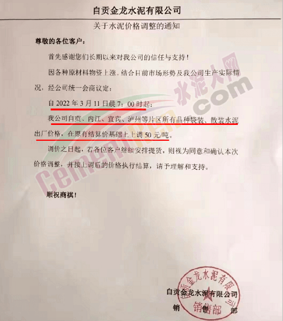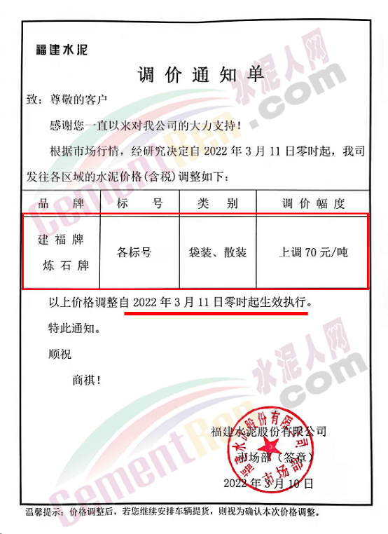 梅州市塔牌營銷有限公司通知,依照《水泥購銷合同》的約定,經福建塔牌水泥有限公司授權通知及我公司研究決定,自2022年3月14日零時起,福建、梅州基地各廠所有散裝水泥出廠結算價格分別在現行價格基礎上上調70元/噸,所有熟料、袋裝水泥出廠結算價格分別在現行價格基礎上上調50元/噸。