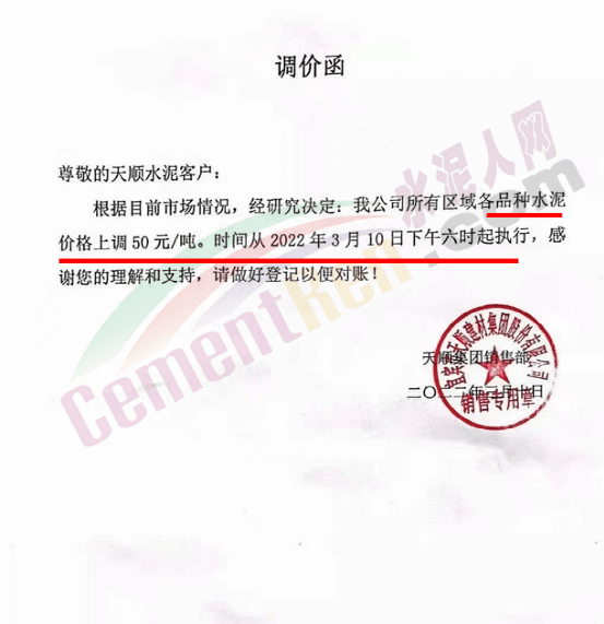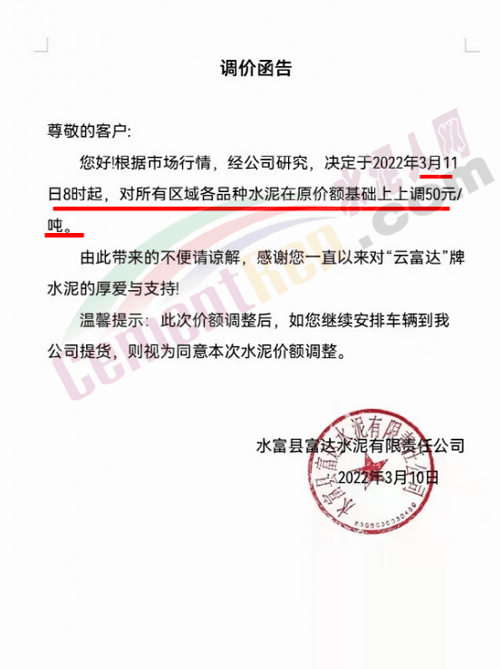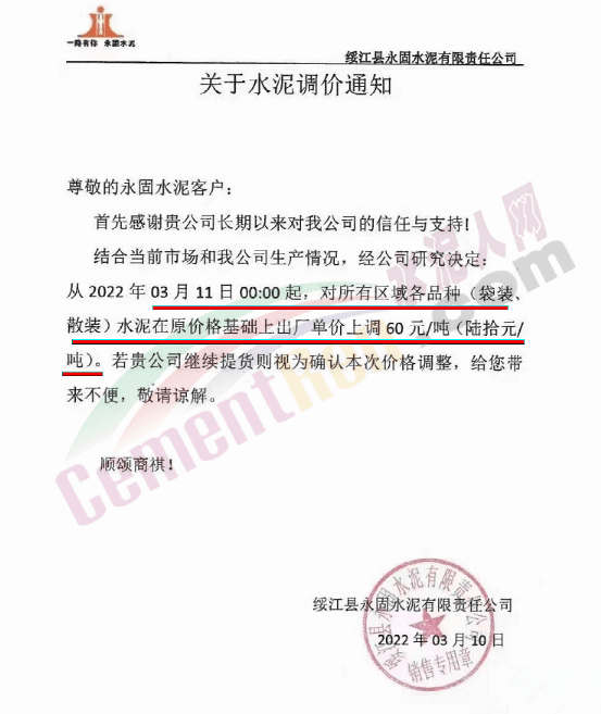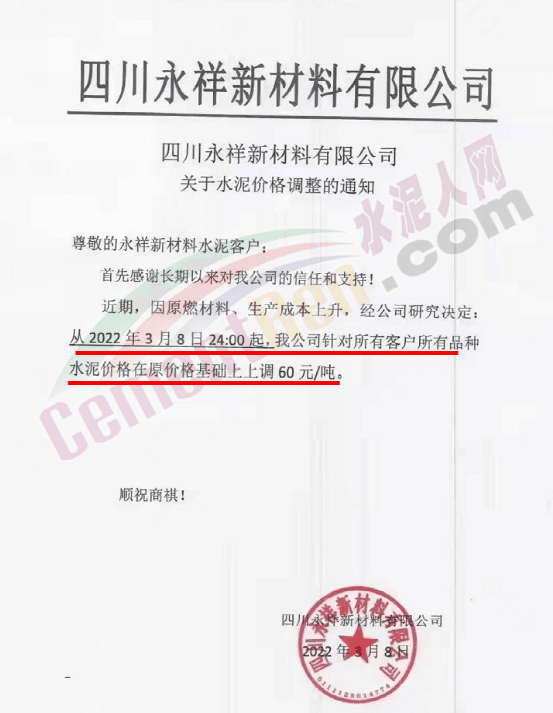 同日,梅州市紅日旋窯水泥有限公司通知自3月14日起各品種、各強度等級的袋裝水泥在原價基礎上上調50元/噸。