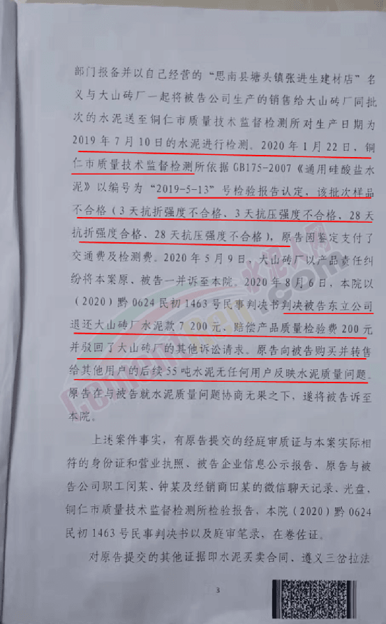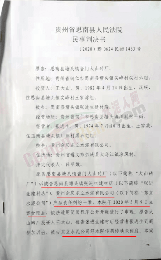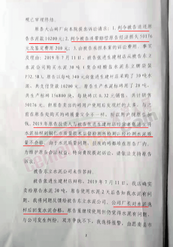 2020年3月27日把檢驗報告及市場監督管理取樣的經過傳給了生產企業相關負責人。因遲遲未收到答復,磚廠一紙訴狀將銷售者思南縣塘頭鎮張進生建材店及東立水泥廠告上法庭。
