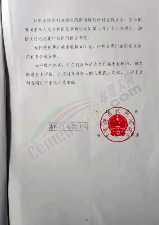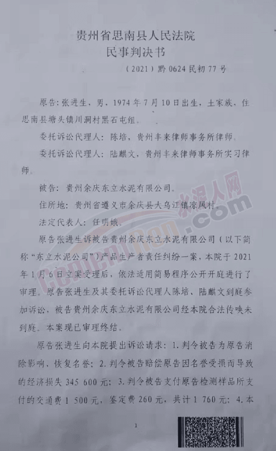 貴州省思南縣人民法院民事判決書顯示東立水泥公司庭審后提交答辯狀辯稱,原告名譽是否受損與被告無因果關系、原告要求被告恢復名譽、賠償損失無事實和法律依據;因樣品檢測程序違法,對檢測報告不予認可,該檢測報告也不應被法院采納; 原告主張的經濟損失345600元的請求權基礎不明,且并未提供該損失因水泥質量導致,不應支持,請依法駁回原告訴訟請求。