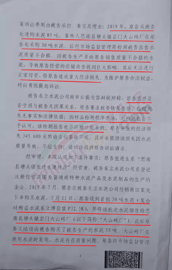 雖法錘落下,事情卻并未到此結束,因銷售東立水泥權益受損,張進生向法院起訴,要求東立水泥消除影響,恢復其名譽,并要求賠償因名譽權受損而導致的經濟損失。