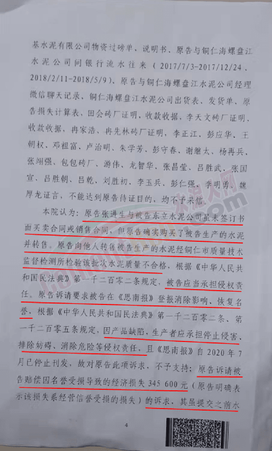 法院認為,原告張進生與被告東立水泥公司雖未簽訂書面買賣合同或銷售合同、但原告確實購買了被告生產的水泥并轉售。原告向他人轉售被告生產的水泥經銅仁市質量技術監督檢測所檢驗該批次水泥質量不合格,根據《中華人民共和國民法典》第一千二百零二條規定,被告應當承擔侵權責任。原告訴請要求被告在《思南報》登報消除影響、恢復名譽、根據《中華人民共和國民法典》第一千二百零二條、第一千二百零五條規定,因產品缺陷,生產者應承擔停止侵害、排除妨礙、消除危險等侵權責任且《思南報》自 2020年7 月已停止刊發,故對原告此項訴求、不予支持;