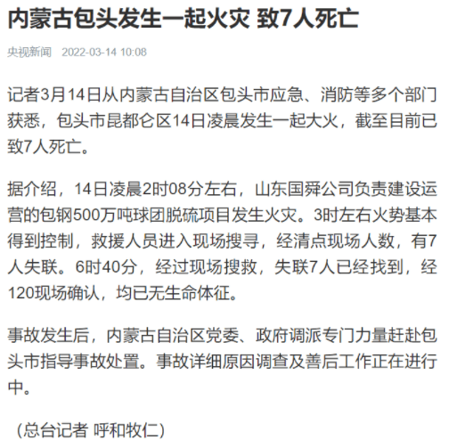 據介紹,14日凌晨2時08分左右,山東國舜公司負責建設運營的包鋼500萬噸球團脫硫項目發生火災。3時左右火勢基本得到控制,救援人員進入現場搜尋,經清點現場人數,有7人失聯。6時40分,經過現場搜救,失聯7人已經找到,經120現場確認,均已無生命體征。
