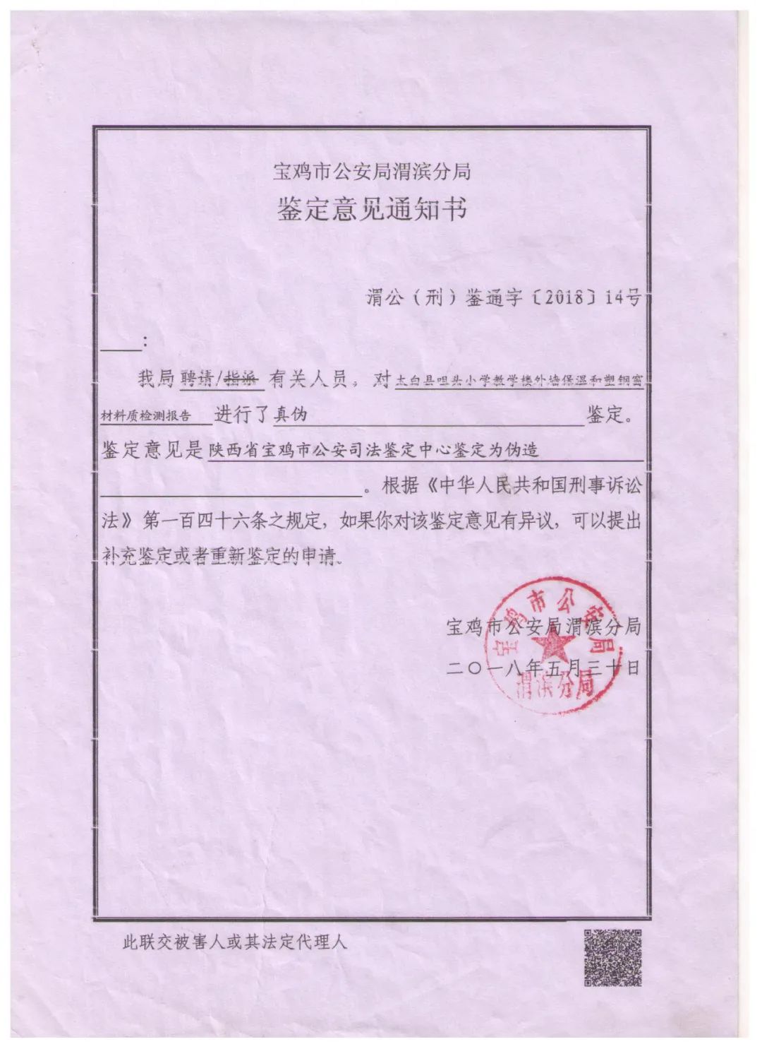 根據2018年5月寶雞市公安局渭濱分局出具的鑒定意見通知書,公安機關聘請有關人員對太白縣咀頭小學教學樓外墻保溫和塑鋼窗材料質檢測報告進行了真偽鑒定,陜西省寶雞市公安司法鑒定中心鑒定為偽造。