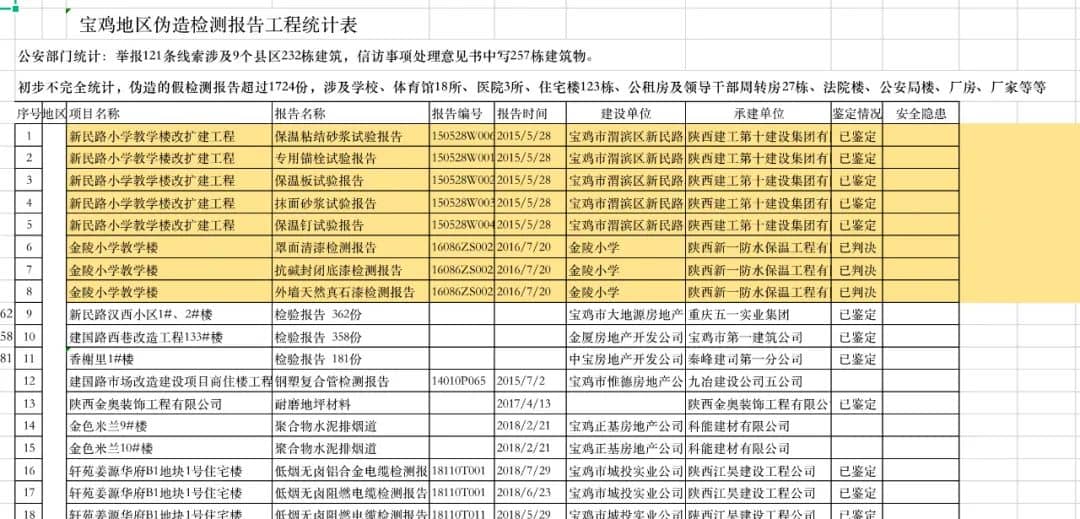 據張女士的不完全統計,包括經公安已鑒定或者司法已判決的在內,寶雞市各縣區已被發現的偽造張女士檢測機構印章的有1718份假工程質量檢測報告,涉及學校、體育館18所,醫院3所,居民住宅樓123棟,公租房及領導干部周轉房27棟。少部分檢測報告雖尚未得到公安的最終鑒定結論,但張女士所在機構從未對這些項目做過任何檢測。