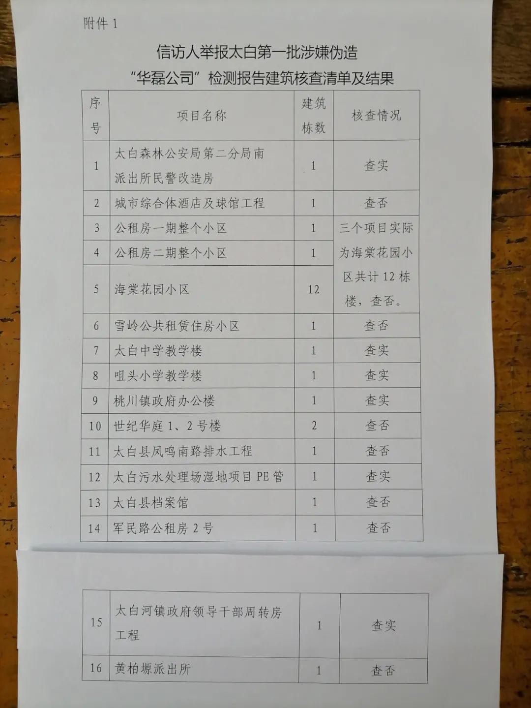 △公安機關鑒定證實,太白縣中學教學樓相關檢測報告系偽造