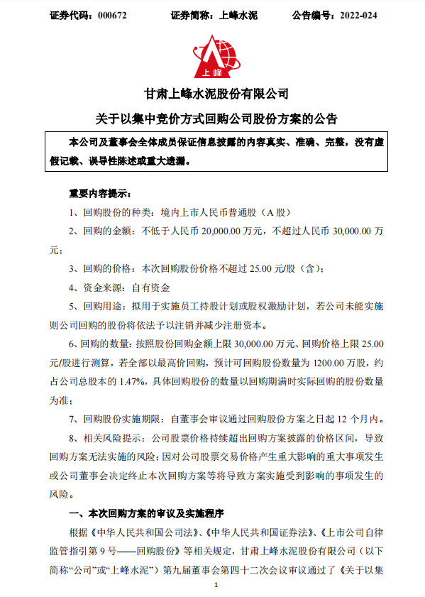 3月15日晚間上峰水泥公告,基于對公司未來發展前景的信心以及對公司價值的認可,擬以自有資金2~3億元回購公司股份用于實施員工持股計劃或股權激勵計劃。這也是公司結合財務狀況、經營情況以及未來盈利能力和發展前景等因素,為維護廣大投資者利益,增強投資者信心而采取的務實舉措。