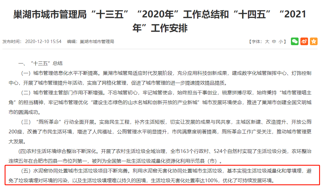 這一點(diǎn)在巢湖市城市管理局“十三五”2020年工作總結(jié)中得到了印證:“水泥窯協(xié)同處置城市生活垃圾項(xiàng)目不斷完善。利用水泥窯無(wú)害化協(xié)同處置城市生活垃圾,基本實(shí)現(xiàn)生活垃圾減量化和零填埋,避免了垃圾填埋對(duì)環(huán)境的污染,以及生活垃圾填埋難以持久的困境,生活垃圾無(wú)害化處置率達(dá)100%,優(yōu)化了可持續(xù)發(fā)展環(huán)境。”在第五屆全國(guó)文明城市創(chuàng)建評(píng)比中,巢湖市脫穎而出。中材安徽在文明創(chuàng)城的進(jìn)程中功不可沒。
