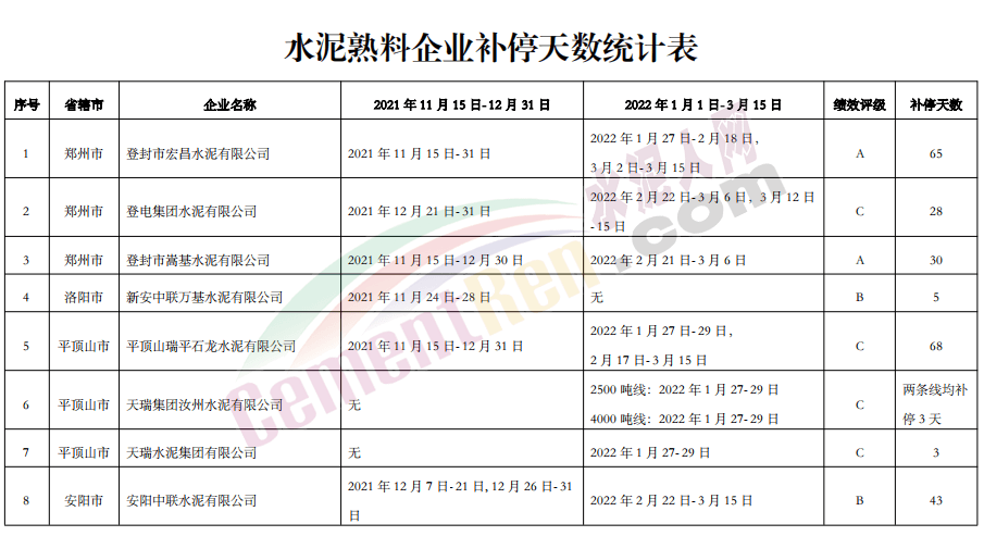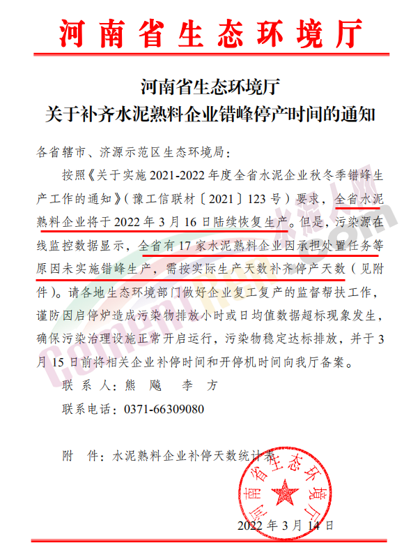 3月14日,河南省生態環境廳發布《關于補齊水泥熟料企業錯峰停產時間的通知》稱全省水泥熟料企業于2022年3月16日陸續恢復生產。但是,污染源在線監控數據顯示,全省有17家水泥熟料企業因承擔處置任務等原因未實施錯峰生產,需按實際生產天數補齊停產天數。