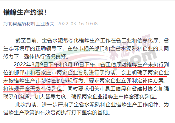 同期,河北省建筑材料工業協會發消息稱,2022年3月9日下午和3月10日下午,河北省工信廳對錯峰生產未執行到位的邯鄲市和石家莊市兩家企業分別進行了約談,會上明確了兩家企業未按錯峰生產計劃停窯的違規行為,要求兩家企業立即制定補停方案,將違規開窯天數補停到位。同時要求相關市縣工信局和省建材協會加強聯系和溝通,加大督導力度,確保兩家企業錯峰生產停窯落實到位。