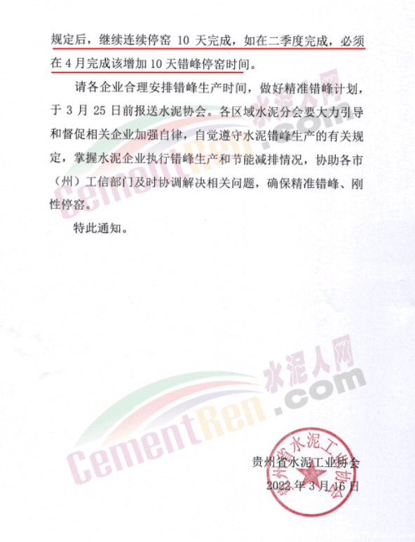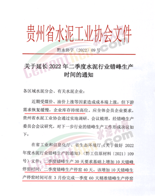 3月16日,貴州省水泥工業協會發布了《關于延長2022年二季度水泥行業錯峰生產時間的通知》稱,近期受煤價、油價上漲等因素造成成本端上漲,但下游需求恢復緩慢,企業庫存持續高位。應企業要求延長2022年錯峰生產時間,其中二季度錯峰生產30天要求基礎上增加10天錯峰停窯時間,二季度錯峰生產停窯 40天。