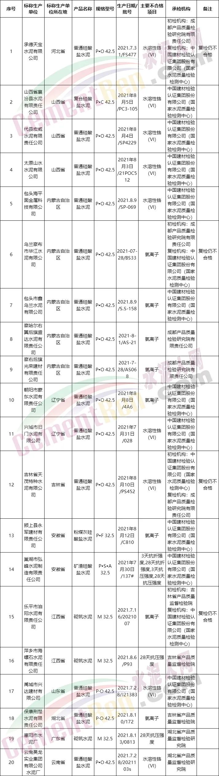 21家企業(yè)中承德天寶水泥有限公司、烏蘭察布市華江水泥有限公司、吉林省天茂特種水泥有限公司、樂平市洎陽水泥有限責(zé)任公司4家企業(yè)復(fù)檢仍不合格。