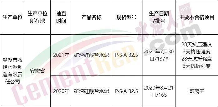 巢湖市弘峰水泥制造有限責(zé)任公司3天抗折強(qiáng)度,28天抗折強(qiáng)度,3天抗壓強(qiáng)度,28天抗壓強(qiáng)度等項(xiàng)目均不合格。且連續(xù)兩年抽檢不合格,上一年不合格項(xiàng)目為氯離子。