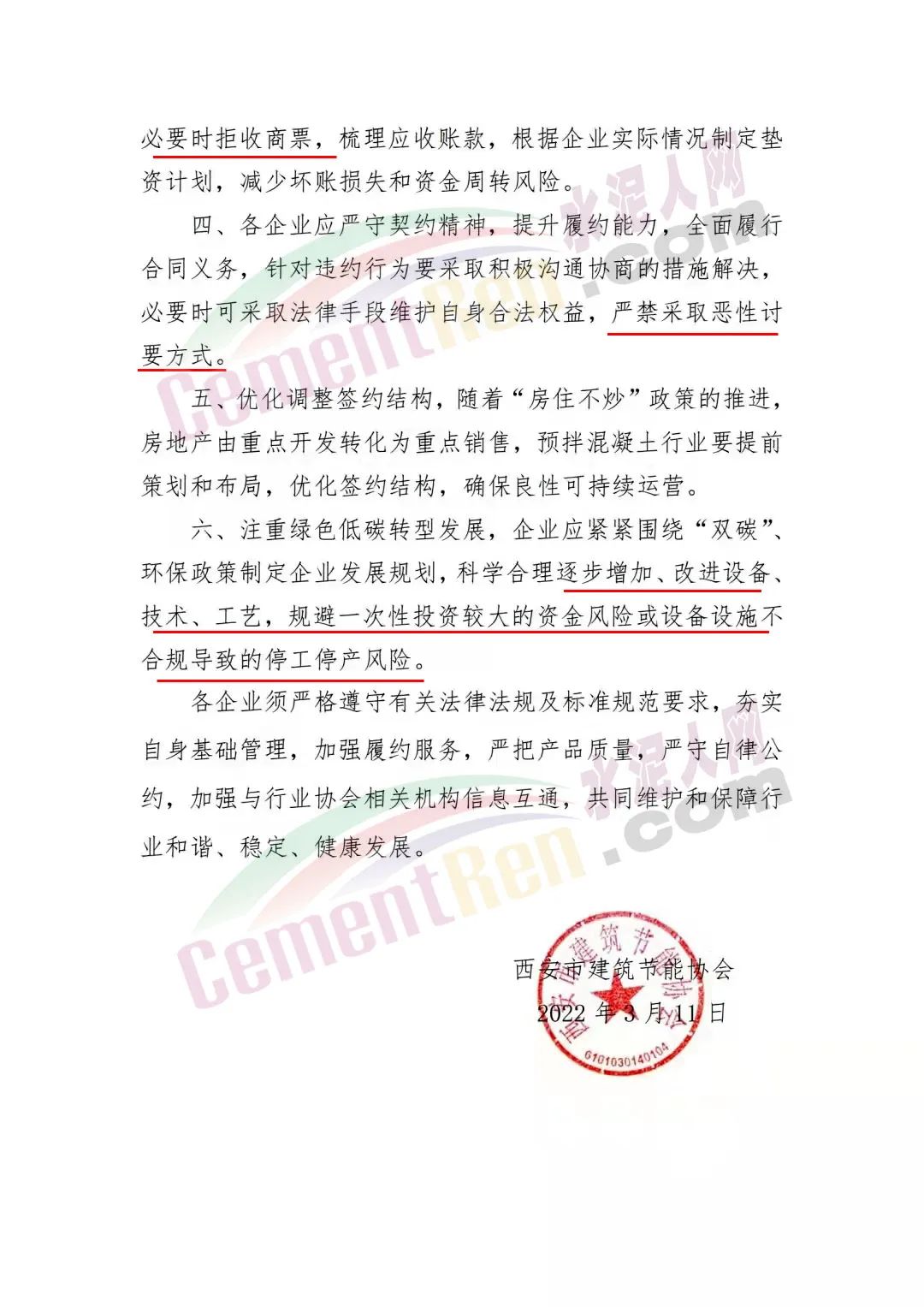 日前,西安市建筑節能協會發文稱,近期,西安市混凝土行業面臨商業承兌匯票兌付風險、融資環境緊縮、原材料價格上漲等因素造成的資金壓力增大,加之受本輪疫情的沖擊,導致市場需求受阻。協會特發布風險防范提示及倡議: