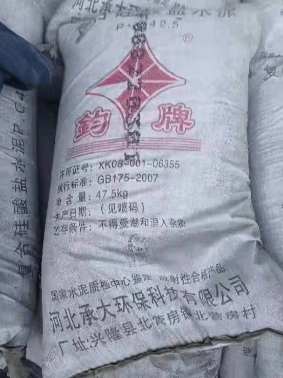 一款42.5水泥,標稱生產企業為河北承大環保科技有限公司,凈含量47.5kg。生產許可證編號標稱為XK08-001-06355。生產日期噴碼顯示“220301”字樣。