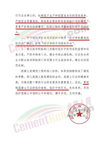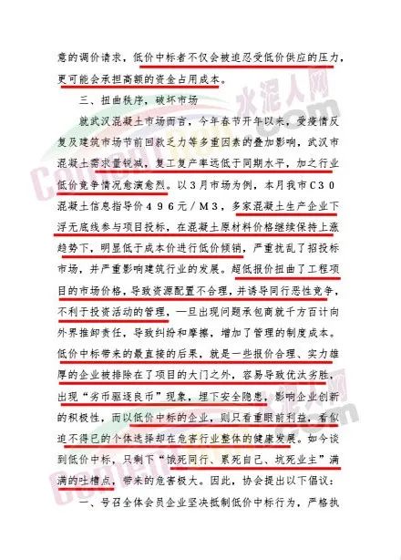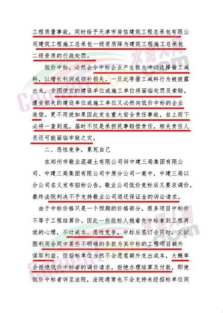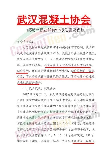 日前,武漢混凝土協(xié)會發(fā)布《混凝土行業(yè)低價中標(biāo)危害及倡議》給會員單位稱,混凝土行業(yè)本就竟?fàn)幖ち遥诮灰讬C(jī)會稀缺的當(dāng)下,為了在激烈的招投標(biāo)競爭中脫穎而出,獲得中標(biāo)資格,不少混凝土企業(yè)選擇了壓低中標(biāo)價格,低價搶標(biāo)。而過往的慘痛教訓(xùn)告訴我們,低價搶標(biāo)這一短視行為,不僅將造成諸多法律風(fēng)險及隱患,更將對這個行業(yè)造成難以挽回的損失。