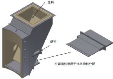 為降低系統(tǒng)內(nèi)漏風(fēng)、提高旋風(fēng)筒分離效率,將現(xiàn)有C1~C5翻板閥更換為動(dòng)作靈活、鎖風(fēng)效果好的具有德國洪堡KHD專利技術(shù)的新型翻板閥,新型翻板閥的形式見圖2-1;同時(shí)對各級撒料箱更換成KHD可調(diào)節(jié)型撒料箱,并對撒料箱位置、結(jié)構(gòu)進(jìn)行了調(diào)整和優(yōu)化,撒料箱形式見圖2-2