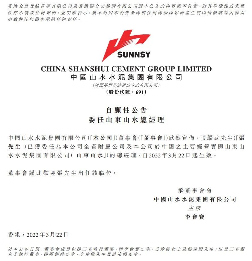 山水水泥3月22日晚間發(fā)布公告,張繼武已獲委任為公司全資附屬公司及公司于中國(guó)之主要經(jīng)營(yíng)實(shí)體山東山水水泥集團(tuán)有限公司(“山東山水”)的總經(jīng)理,自2022年3月22日起生效。