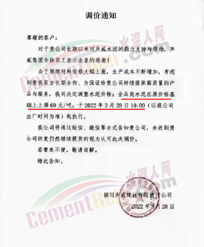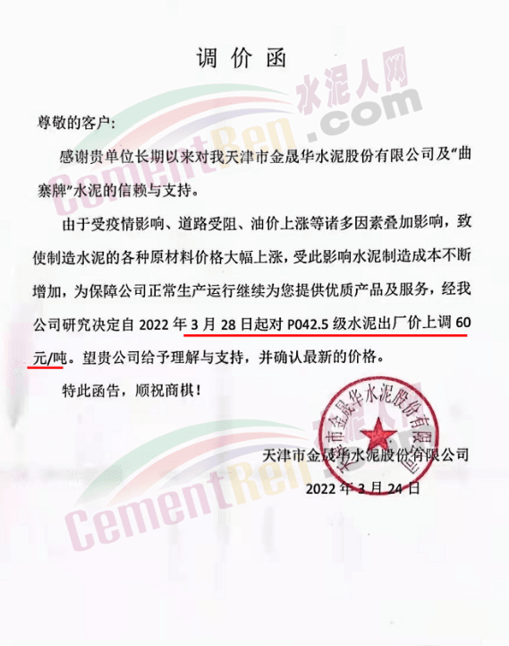 天津山水水泥有限公司調價函稱,近期受疫情、錯峰生產、油價上漲等多方面因素持續影響,原材料及運輸成本大幅上漲,水泥制造成本激增。為保障公司正常生產運行,繼續為客戶提供優質產品及服務,經廠家決定水泥價格自3月28日上午8時起P.O42.5散裝水泥上調60元/噸。