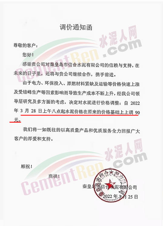秦皇島市信合水泥有限公司通知,3月28日上午8時起水泥價格上90元/噸。