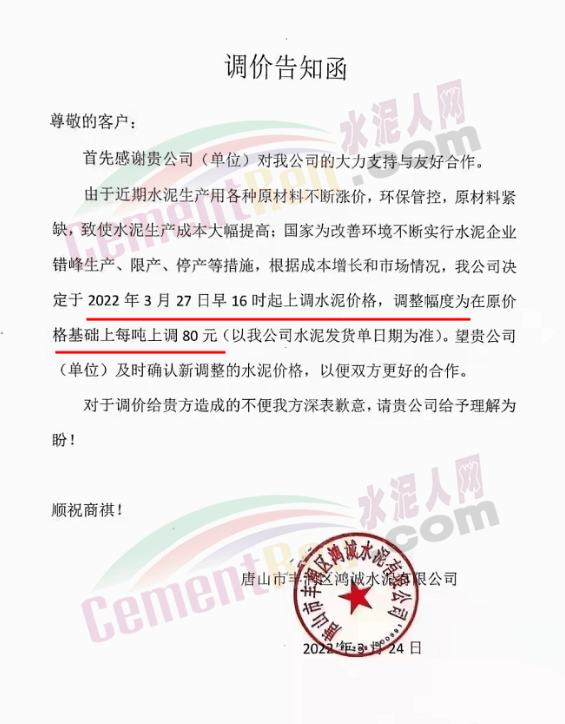唐山市豐潤區鴻誠水泥有限公司通知,3月27日16時起上調水泥價格80元/噸。