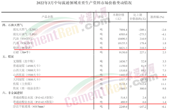 國家統計局數據顯示,2022年3月中旬流通領域石油、天然氣、煤炭、P.O42.5散裝水泥較3月上旬同比均為上漲,其中0號柴油上漲210.3元/噸,漲幅2.5%;山西優混550大卡煤炭上漲121.9元/噸,漲幅9.1%;P.O42.5散裝水泥上漲6.6元/噸,漲幅1.4%。