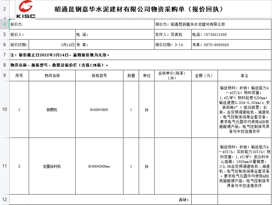 近日,昭通昆鋼嘉華水泥建材有限公司發(fā)布一條物資采購(gòu)單,其需要采購(gòu)一臺(tái)規(guī)格型號(hào)為B1600*3600的板喂機(jī)。其參數(shù)為,輸送物料:砂巖;輸送能力4~40T/h;物料容重:1.4T/M3;