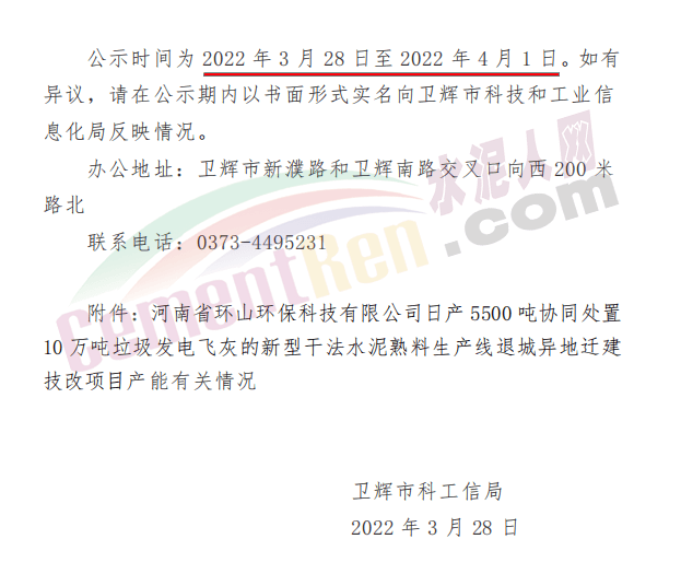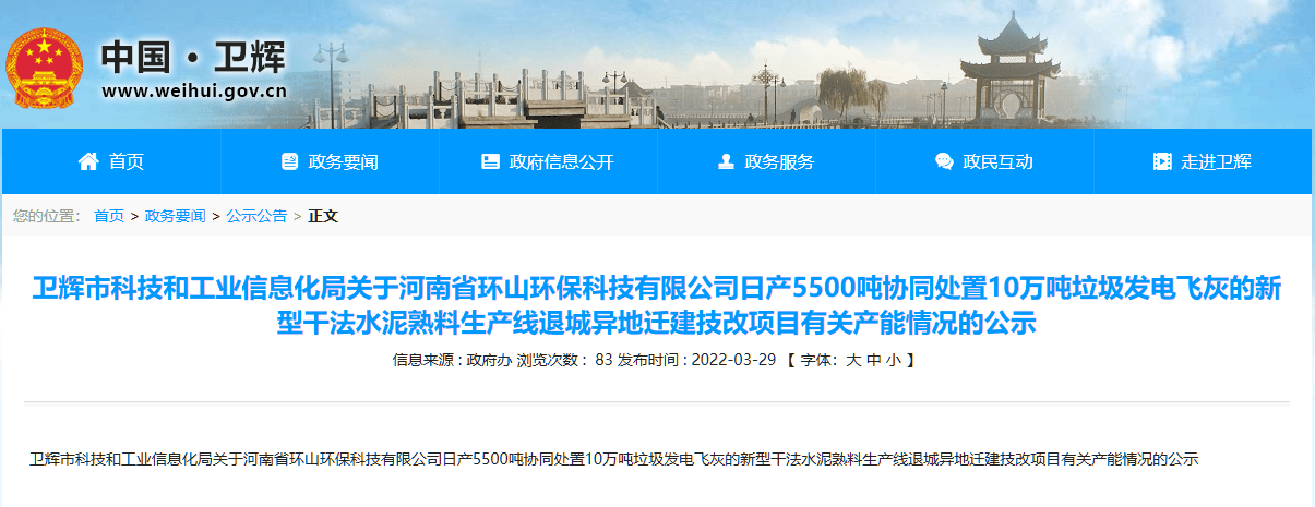 日前,河南衛(wèi)輝政府辦轉(zhuǎn)發(fā)衛(wèi)輝市科技和工業(yè)信息化局《關(guān)于河南省環(huán)山環(huán)保科技有限公司日產(chǎn)5500噸協(xié)同處置10萬噸垃圾發(fā)電飛灰的新型干法水泥熟料生產(chǎn)線退城異地遷建技改項目有關(guān)產(chǎn)能情況的公示 》